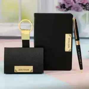 This black and gold gift set is ideal for a boyfriend who loves to write. That will add a touch of status to his everyday routine. The collection includes the smart leatherette notebook, matte finish pen with blue ink. Also, a visiting card holder and a stylish keychain.
